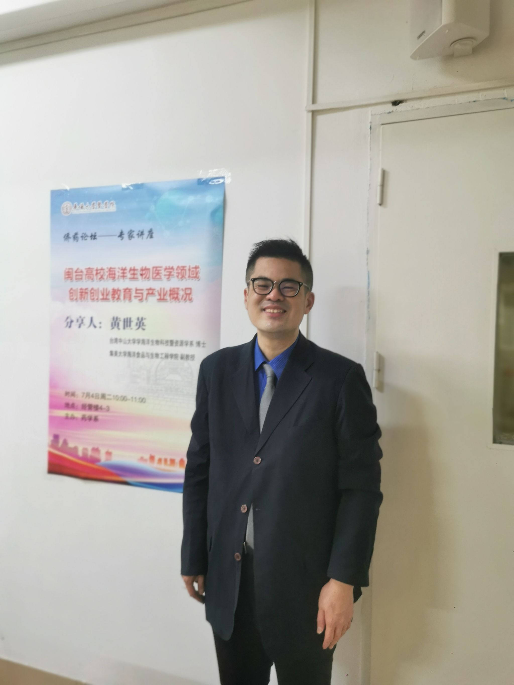 台湾中山大学学海洋生物科技暨资源学系博士、集美大学海洋食品与生物工程学院黄世英副教授应邀出席,做了题为《闽台高校海洋生物医学领域创新创业教育与产业概况》的报告。黄世英副教授总结了福建省和台湾地区海洋生物特色领域的高校、公司及产品研发成果,以此启发同学们从创新角度,针对海洋生物产业领域,设计开发对社会、经济、科研等方面的效益或贡献的创业项目。讲座过程中,同学们就创新创业项目如何开展进行了积极互动,气氛融洽。