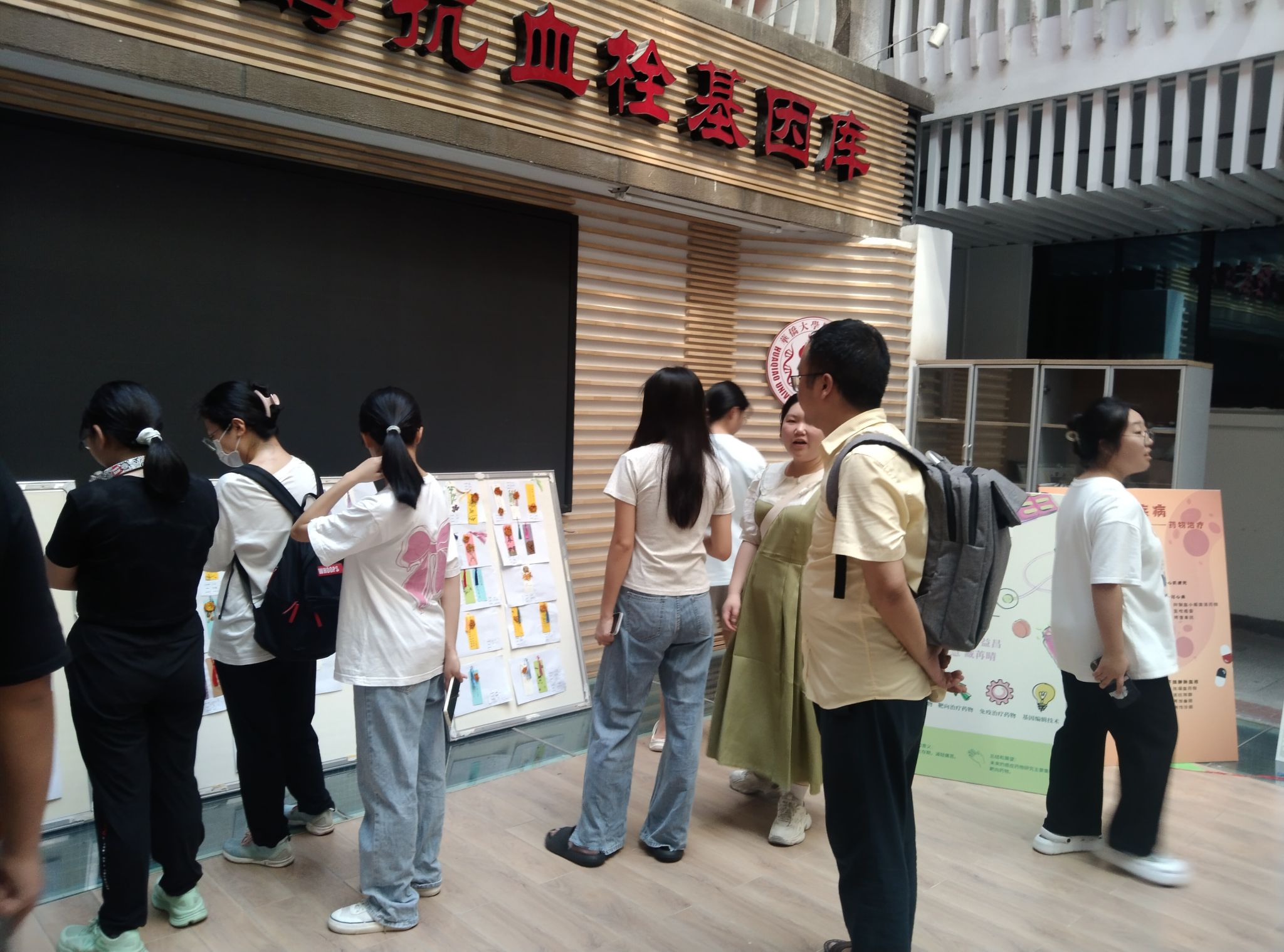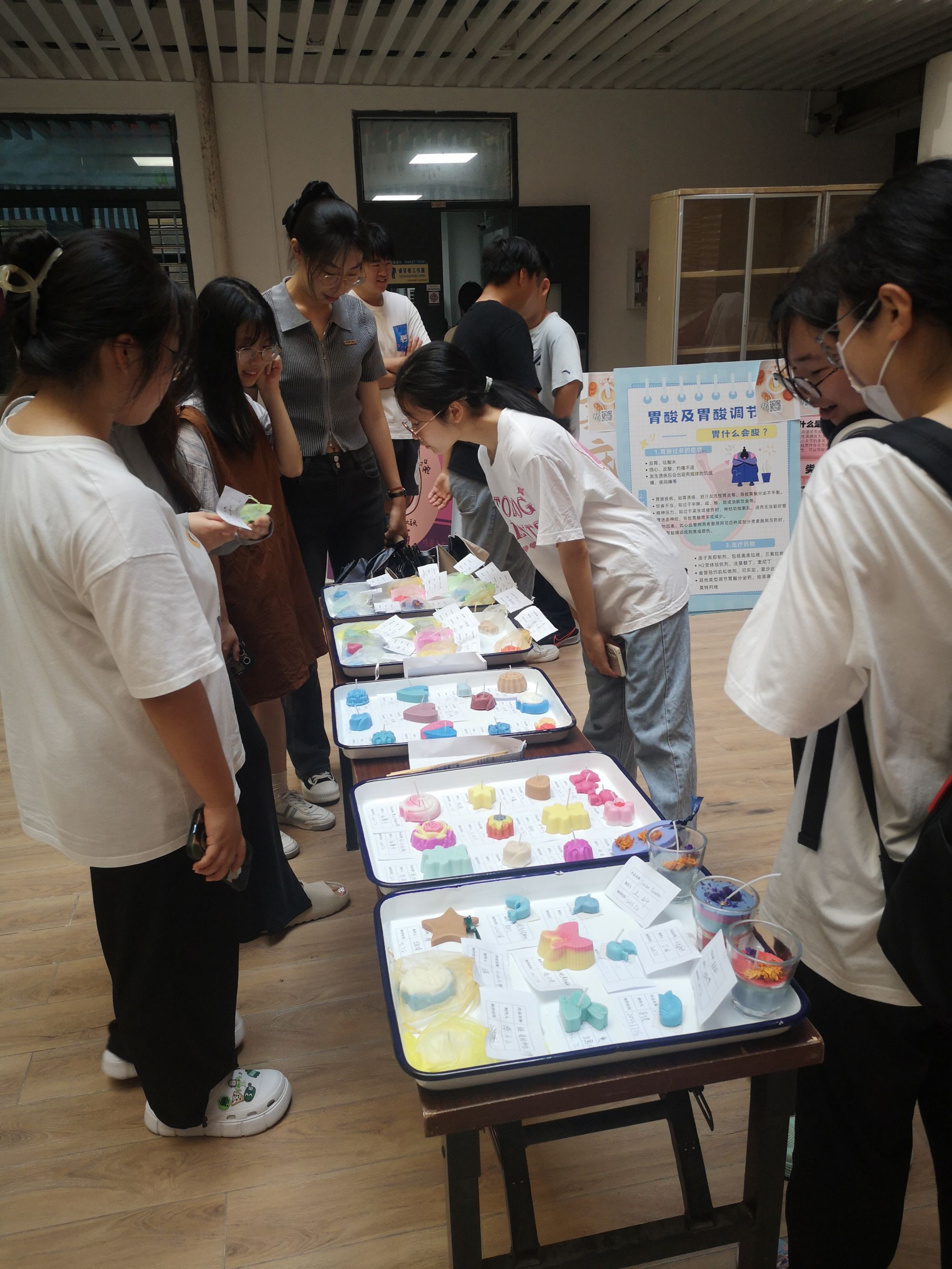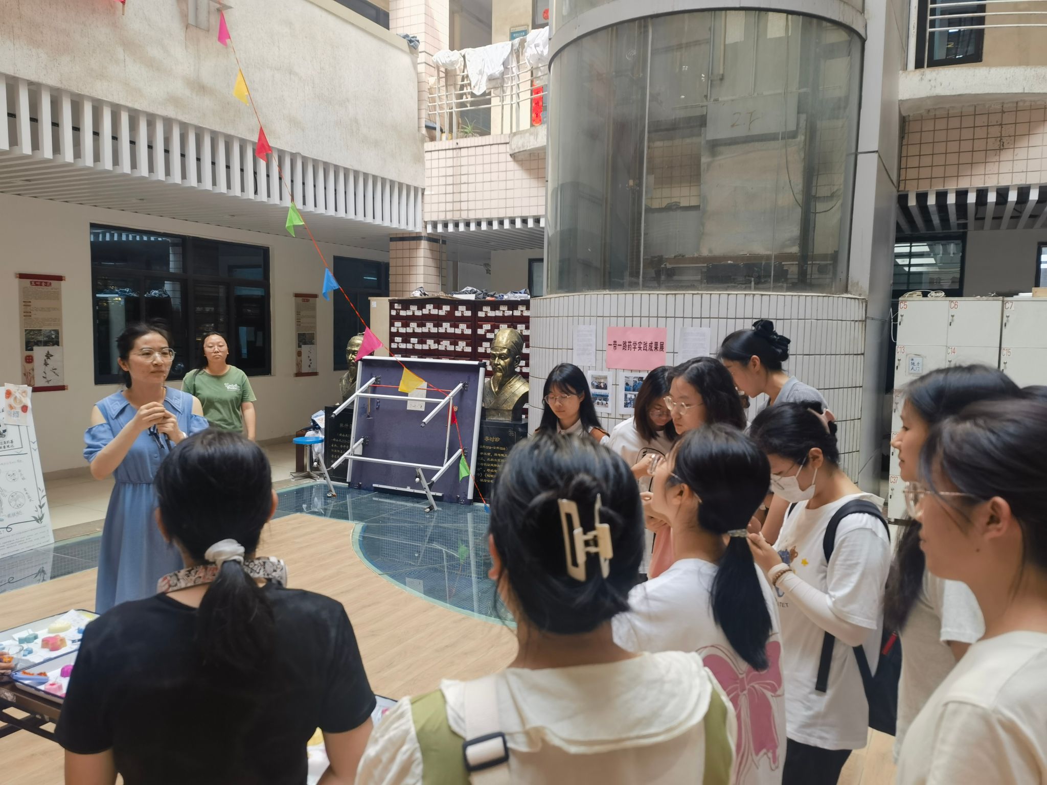 中庭进行展出。闻一下香囊,看一眼书签,点一支药香,燃一个药蜡……欣赏作品的过程中同学们对不同的作品进行讨论学习和点评。药学系主任徐先祥老师对同学们的作品给予高度认可和充分肯定。