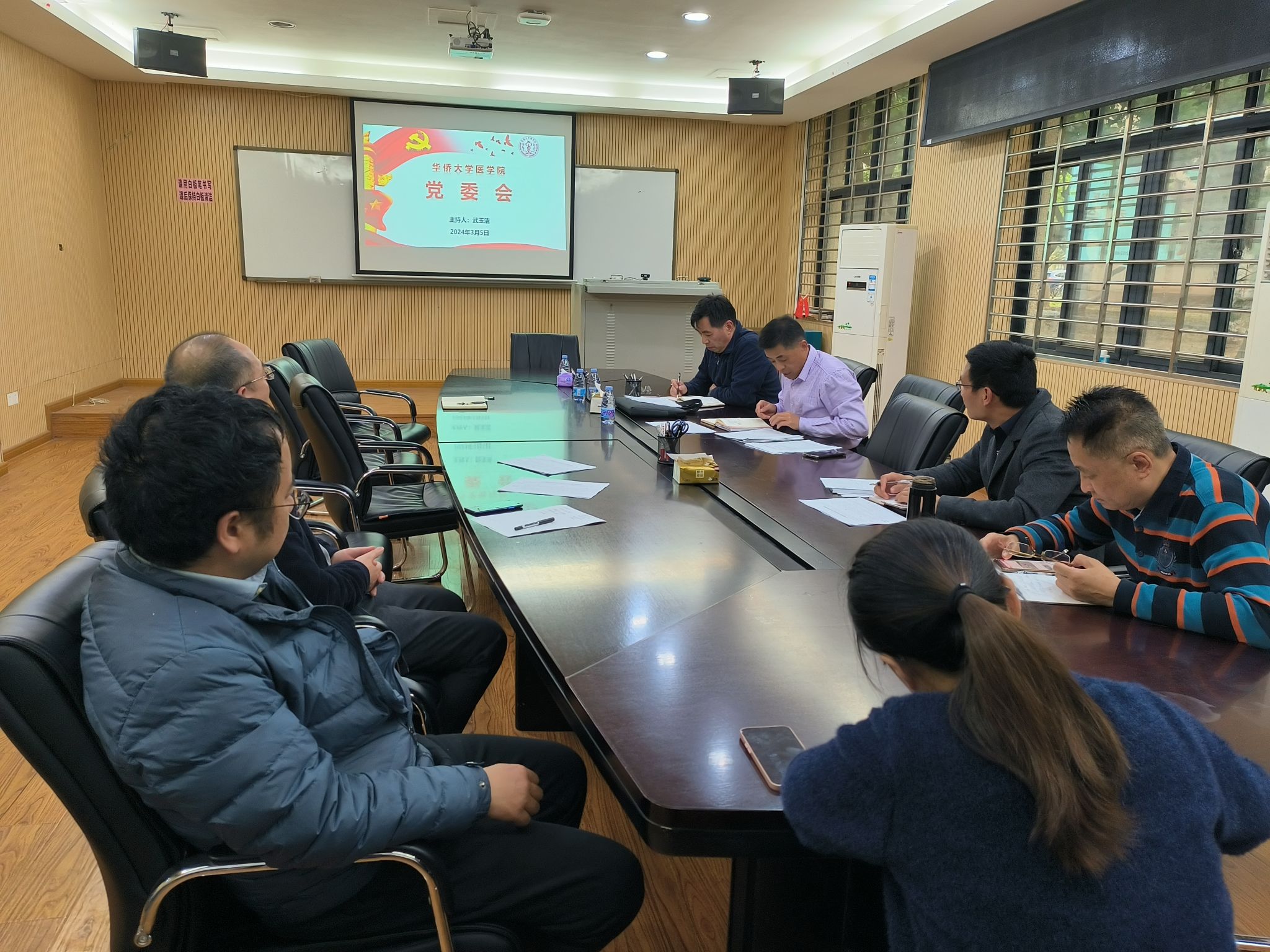 党委在德润楼228会议室召开期初党建工作会议,部署新学期党建工作任务。会议由学院党委书记武玉洁主持,党委委员、组织员与会。