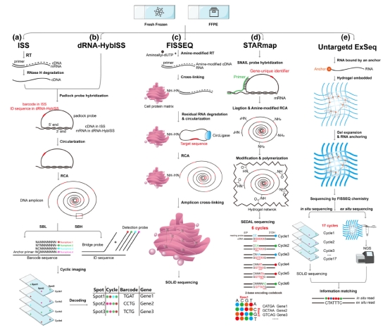 ISS技术自2013年首次发表以来经历了一系列发展和改进,包括ISS、FISSEQ、STARmap、dRNA-HybISS和ExSeq等,以及在此基础上发展而来的商业化技术平台。基于ISS技术的空间转录组学技术已经成为空间基因表达分析最重要的工具之一。本综述首先对这些技术的原理进行了总结,并比较了它们各自的技术特点和优势(图1)。ISS的基本实验流程是使用序列编码的基因特异DNA探针与对应基因的mRNA或cDNA靶点杂交,连接成环后经过滚环扩增(rolling circle amplification, RCA)进行信号放大,利用多轮显微成像于组织的原始位置对基因进行解码并构建其空间表达谱。