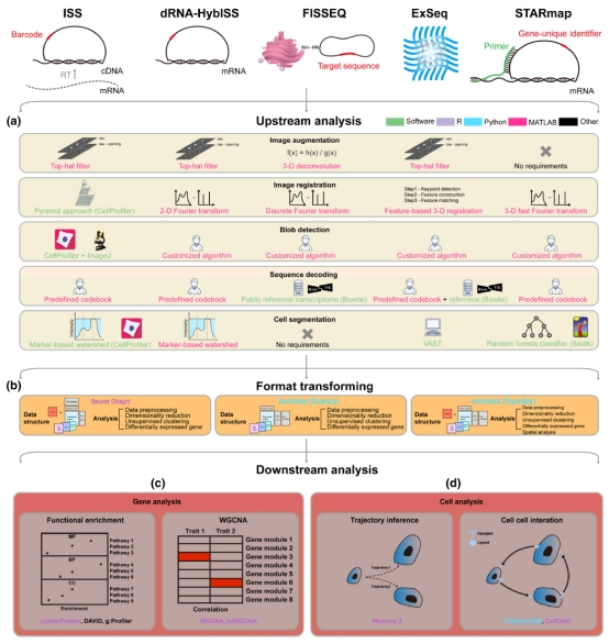 ISS的数据分析主要包括三个部分:上游的图像分析、中游的整合分析和下游的探索分析(图2)。具体来说,上游分析的目的是为了得到显微图像中的基因表达信息,这个过程通常包括多轮图像配准、图像增强、原始图像的碱基识别、多轮碱基合并、碱基序列解码、单细胞分割和空间可视化,最终可以得到单细胞分辨率的空间基因表达矩阵(图2a)。中游分析主要是上下游分析的媒介,将ISS的数据整理为高度可复用的数据格式,主要工具包括R包Seurat,Python库Scanpy和Squidpy(图2b)。下游分析旨在回答具体的科学问题,可以分为基因层面和细胞层面的分析,前者主要包括基因功能富集和共表达模块挖掘,后者主要包括细胞间的通讯及其进展轨迹推断等(图2c和d)。