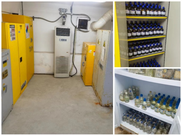 老师和同学们将暂放在柜子外货架上的药品箱打开,对每瓶化学品进行标记,将腐蚀严重的药品柜内的化学品取出,按照公安部公布的《易制爆危险化学品名录》与《易制毒化学品的分类和品种目录》,将化学品按照化学性质、危害等级,将新药品柜按顺序编号,并重新划分了放置区域。化学品放置完毕后,按规格、种类进行了数量清点与复核,并更新了台账。整理工作从上午9:00开始,直至中午12:00结束,共清点了易制毒试剂586瓶,易制爆试剂116瓶。
