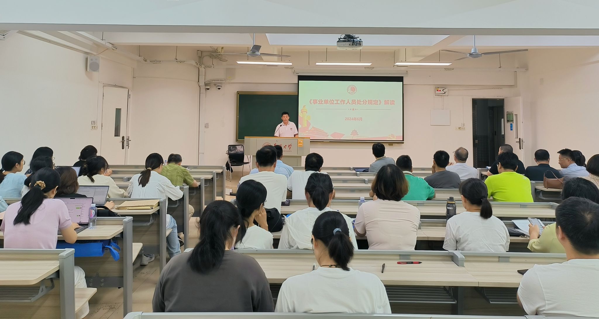 学院党委书记武玉洁向全体教职工介绍了《处分规定》的出台背景、核心内容和深远意义,并对《处分规定》进行了逐条解读,重点讲解了处分的种类、适用条件、处理程序等内容。他还结合具体案例,对违反《处分规定》的行为进行了深入剖析,让教职工们深刻认识到违反规定所带来的严重后果和不良影响。