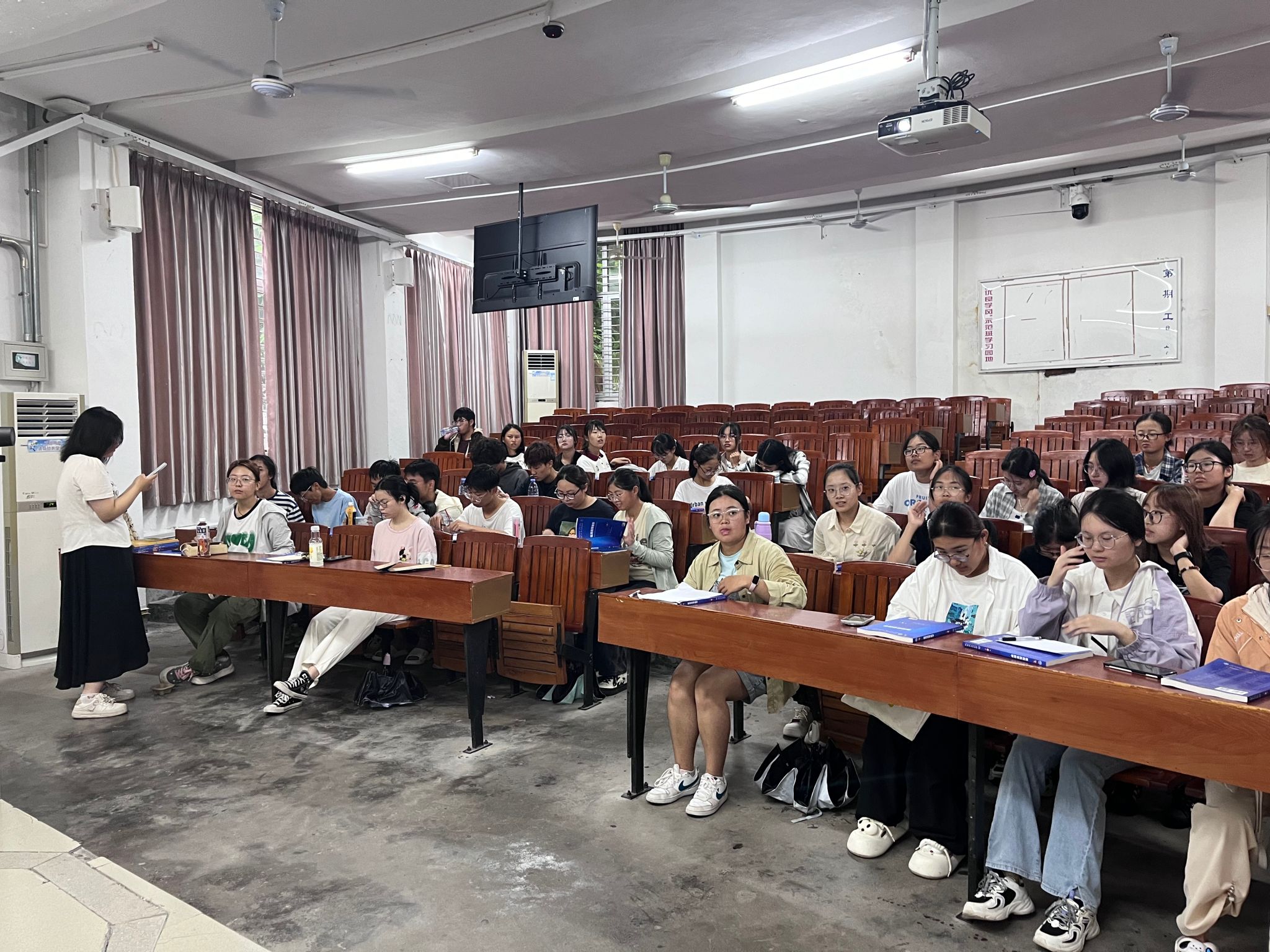 分管教学副院长王福财和本科教学秘书陈小媛到课堂听课。