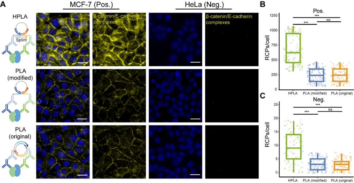 蛋白质相互作用几乎参与细胞的全部生命活动过程,因此蛋白质分子间相互作用的研究不仅有助于我们理解生命活动的基本机制,在疾病诊断、治疗和新药开发等方面具有广泛的应用前景。邻位连接技术(Proximity Ligation Assay,PLA)是一种利用抗体和DNA特异性,通过邻近效应实现蛋白质相互作用的原位检测和定量的技术。柯教授团队开发了一种改进型PLA技术,称为杂交增强邻位连接(HPLA),有效地提高了蛋白质相互作用原位可视化检测的效率。HPLA利用一个额外的夹板探针与邻位连接探针(即抗体-寡核苷酸偶联物)上的DNA杂交,从而稳定同个蛋白分子上邻位连接探针的邻近状态,促进环状探针连接并经滚环扩增信号放大后,与染料标记探针杂交,形成荧光点以可视化蛋白质相互作用。HPLA解决了传统PLA技术检测效率较低的缺点,在癌症相关蛋白质相互作用和信号通路研究中显示出高效用,未来有望成为生物医学研究和临床诊断的新工具。
