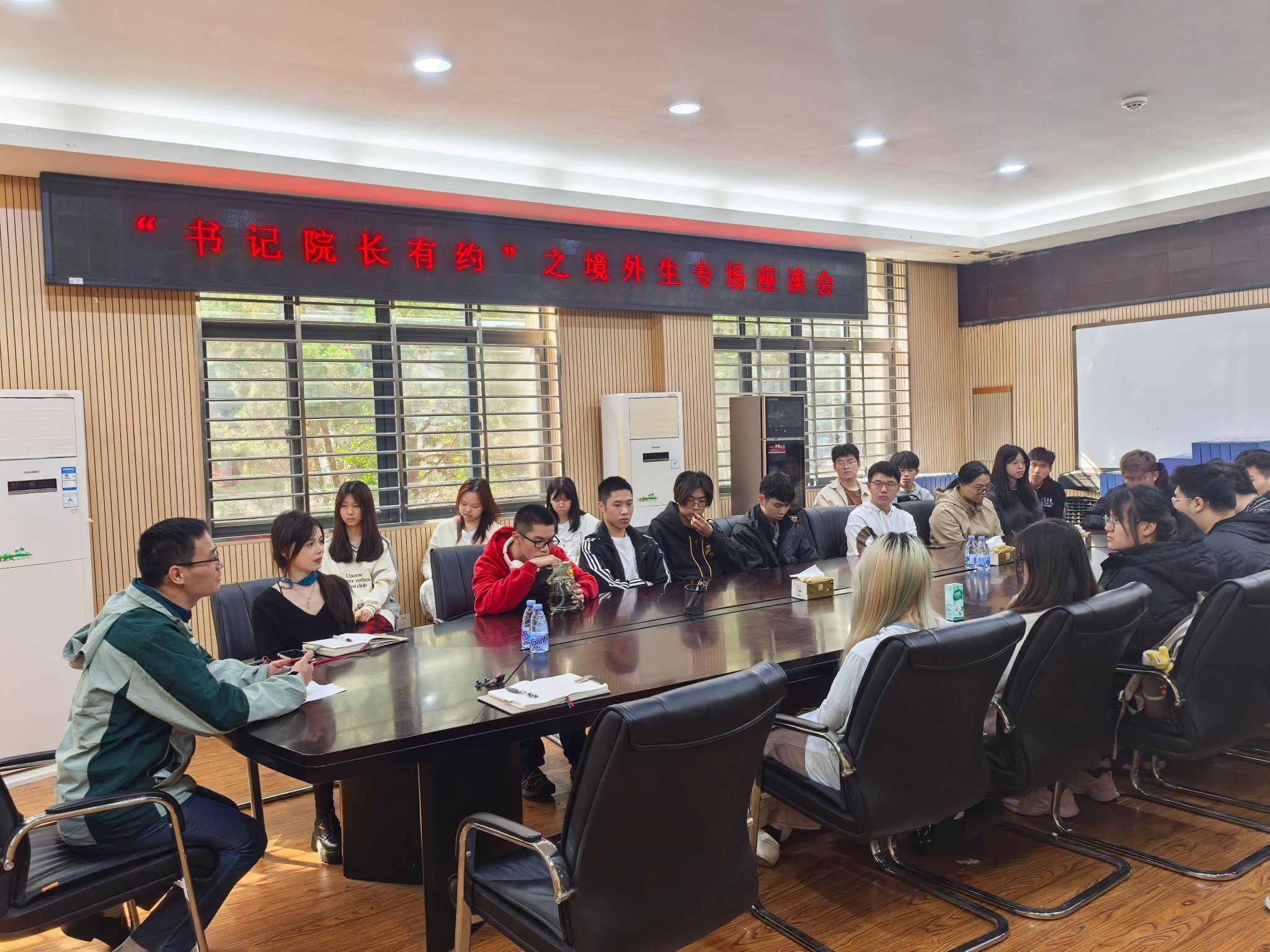 为进一步推进境外生教育教学管理工作,助力境内外学生融合培养,同时帮助境外生解决学习生活中的实际问题,更好的适应大学生活,12月13日上午,学院召开“书记院长有约”之境外新生专场座谈会。院党委书记黄挺、分管教学副院长王福财、辅导员刘晓圆和本科教学秘书陈小媛及2024级境外生同学参加了本次座谈会,会议由王福财副院长主持。