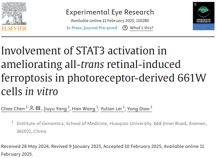 陈超老师团队在眼科学领域国际权威期刊《Experimental Eye Research》(国际眼科研究学会官方期刊,JCR一区)发表题为《Involvement of STAT3 activation in ameliorating all-trans-retinal-induced ferroptosis in photoreceptor-derived 661W cells in vitro》的研究性学术论文。