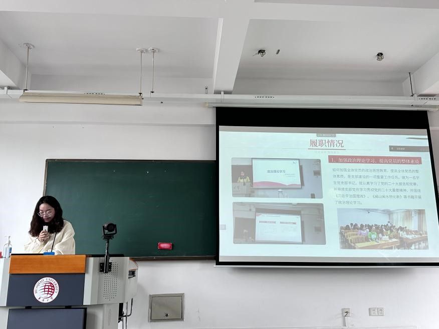 最后党委委员周莹莹对被此次会议进行了总结,她表示党组织开展的各项活动对党性的提升和组织凝聚力的提高有重要重要,在述职工作中准备充分,描述细致,工作扎实。主题党日、党课等活动的开展紧密联系到群众,这样的优秀传统,应该保持传扬下去,在团支部、班级中起到了带头作用。