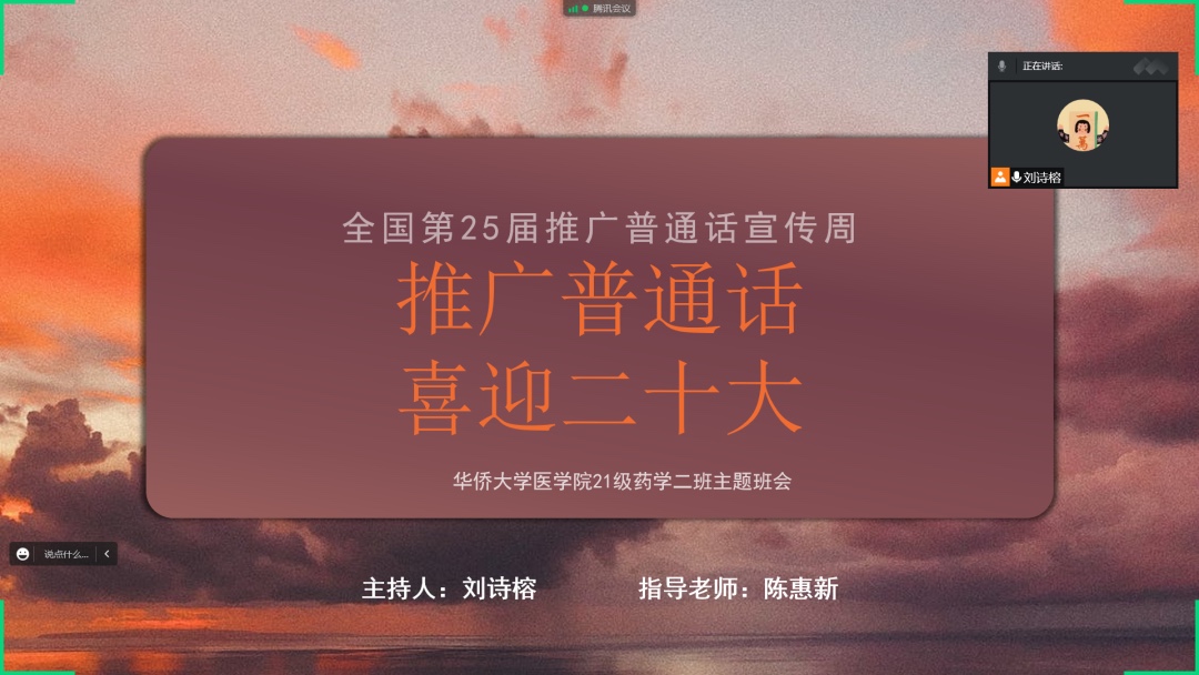 21级药学二班班会总结:作为新一代青年学子,应当具有一定大局观念,学会人与人之间相沟通,人与社会之间相联系,走出国门,走向世界,向全世界人民展示我们的语言魅力,展现我们的大国风采。站在新时代新起点上,我们境内外青年学子更要铸牢中华民族共同体意识,自觉使用普通话,主动当好推广普通话的发声者、宣传员,讲话中国话,喜迎二十大!