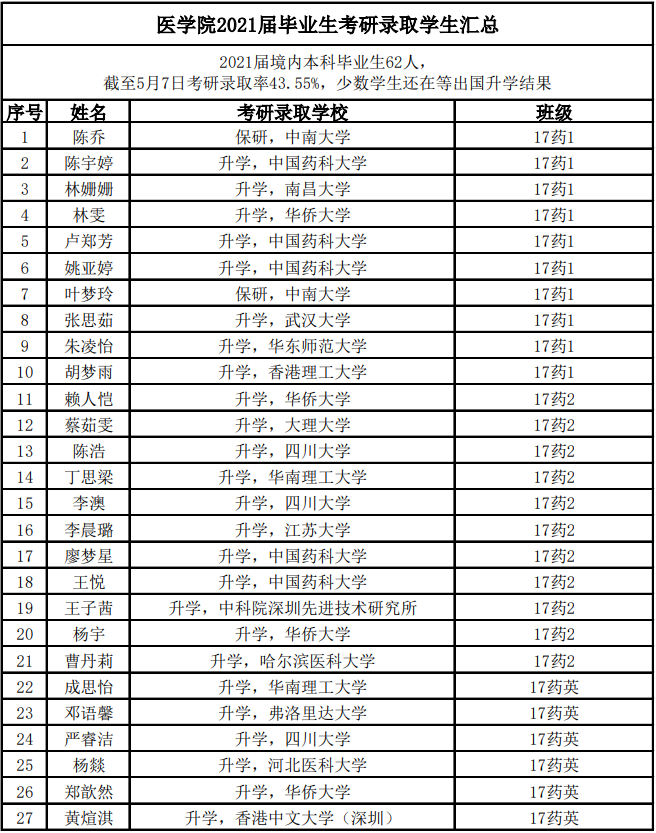 经过全院师生的共同努力,学院2021届药学本科专业62人中,27人实现了升学梦想,升学率达43.55%,再创历史新高!