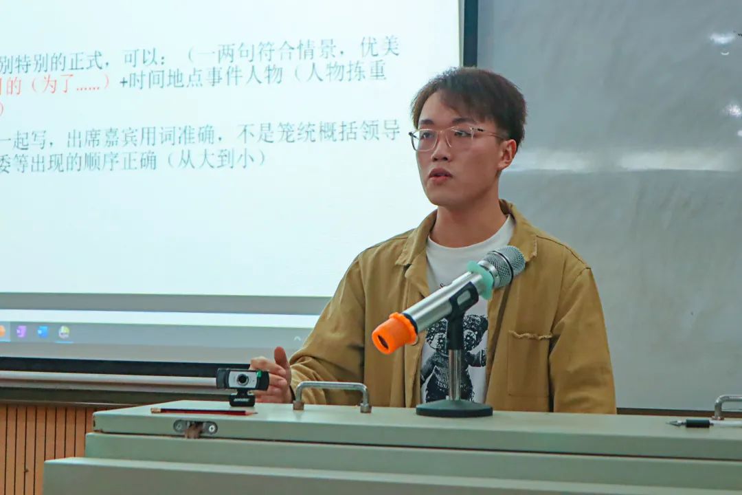 会议开端,负责人朱显宇首先以宣传的内容为始,随后讲解了宣传的作用及其意义所在。针对学院宣传工作所使用的新闻稿,他将其分为标题、正文及结尾三个部分进行了详细分析,并结合相关新闻稿示例进行了对部分注意事项的强调。对于推文的大体格式及内容,朱显宇也进行了深入浅出的说明,并附上部分文案段落以加深理解。