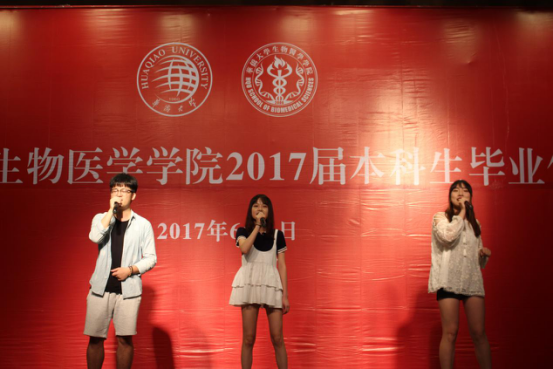 紧接着毕业生陈睿、王晓昕、黄靓欣演唱了由他们自作词曲,包含了所有毕业生名字的歌曲《我药我们在17》,并观看了他们四年大学时光的回顾视频,岁月匆匆,视频里他们渐渐褪去了青涩,变成了现在满腹学识的自信模样。仪式最后,主持人进行总结致辞并宣布仪式到此结束。毕业生们上台在背景板上签下了自己的名字,再见了试剂锈蚀的实验室,再见了学生时光,再见了,2017届毕业生。四年生医人,永为生医人,又是一年毕业季,今夜青春不散场,愿你们的未来光芒万丈。