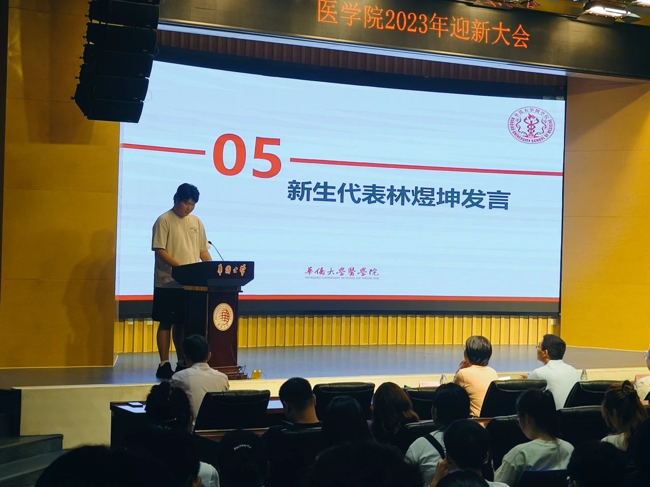 新生代表林煜坤讲述了他学医的初衷,从自身出发,表达了对大学生活的期待,表示自己将以热情的姿态投入到未来的生活之中,并代表全体2023级新生向在场领导、教师提前献上教师节祝福。