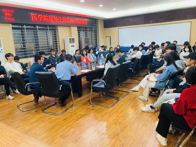 党委书记武玉洁主持,副院长王福财老师,辅导员老师以及各班班主任也出席本次活动。此次活动旨在通过讲解诈骗案例、分享防范方法等形式,让境外生们充分认识到诈骗的危害性,掌握防范技巧,确保个人财产安全。