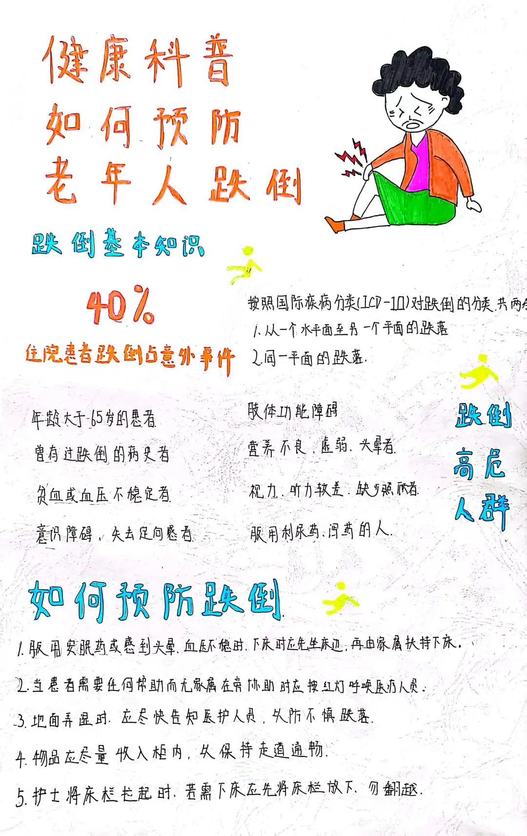 该作品名为“健康科普—如何预防老年人跌倒”。随着冬天的到来,天气逐渐变冷,在下雨下雪后地面很容易湿滑,再加上冬天天气寒凉,许多老年性骨关节病频发,老年人更容易滑倒从而造成骨折。因此,为了尽量防止该事件的发生,制作了该海报。海报介绍跌倒的高危人群和跌倒的定义,详细介绍了如何预防跌倒,尽量避免该事件的发生。
