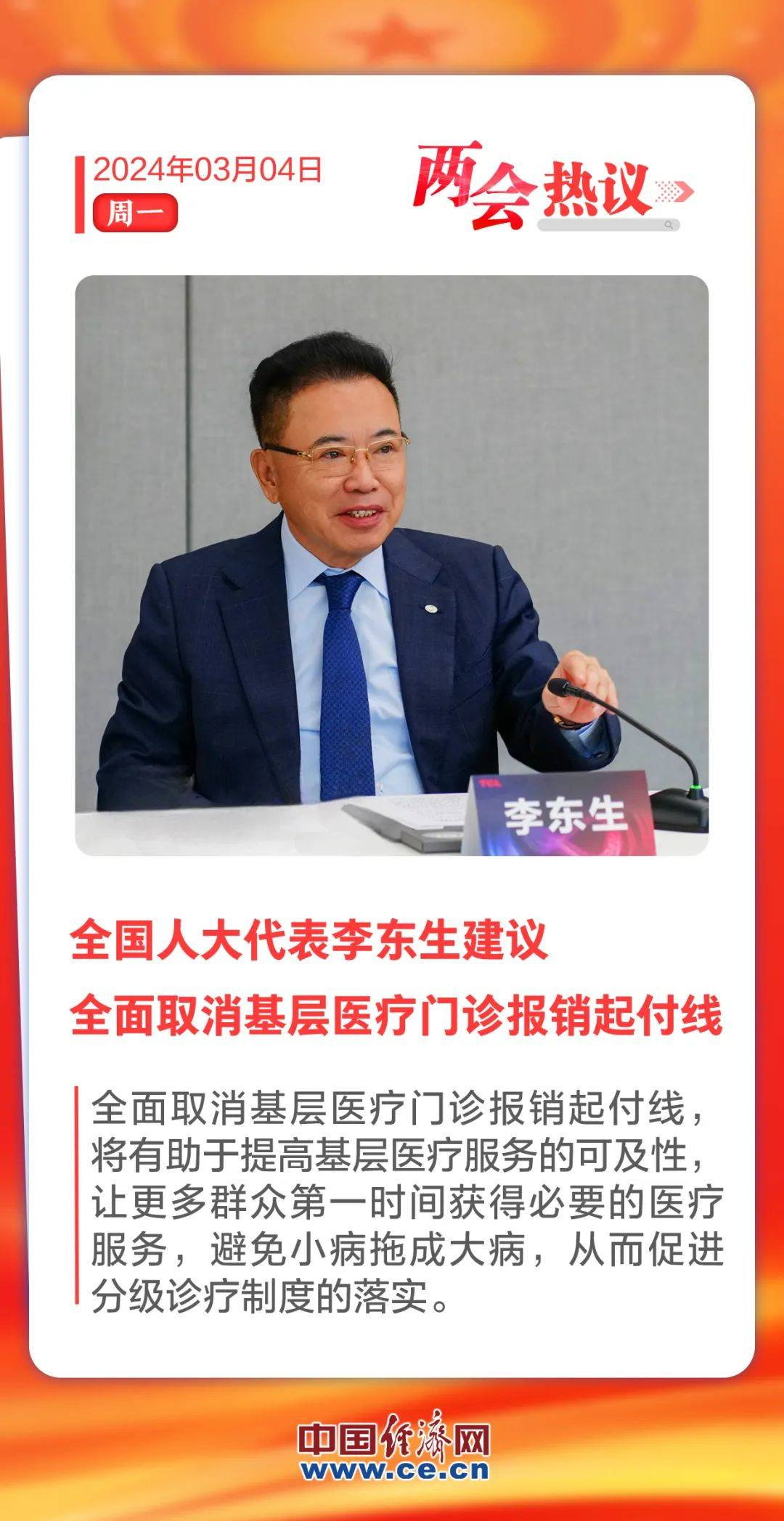 全国人大代表李东生:建议全面取消基层医疗门诊报销起付线