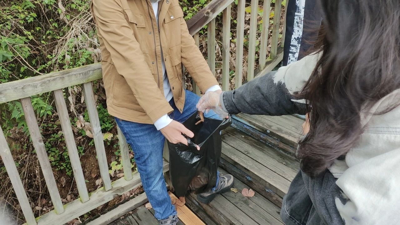 后山栈道入口集合,发放水源保障以及环保工具,如手套、塑料袋、垃圾夹等等,确定行程和核对时间结点,安排公益任务安排。待所有同学准备完整,清点人数,正式出发。