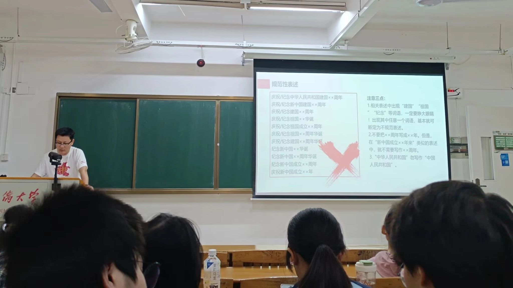 那同学们该如何避免错误的发生呢?张老师通过举例子,说明网上也会出现一些错误表达,应该有所辨别,并建议同学们去找权威发布的正确的表达进行使用。张老师也举了一些同学们容易犯的错误并进行纠正,介绍了一些要慎重使用的词语,点明了规范性表达要注意的几个要点。