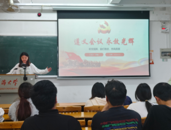 2022级药学二班团支书何婕以《遵义会议,永放光辉》为主题,分享了遵义会议精神包含着深刻的科学内涵,“坚定信念、实事求是、独立自主、敢闯新路、 民族团结”这些都是遵义会议精神的应有之义。